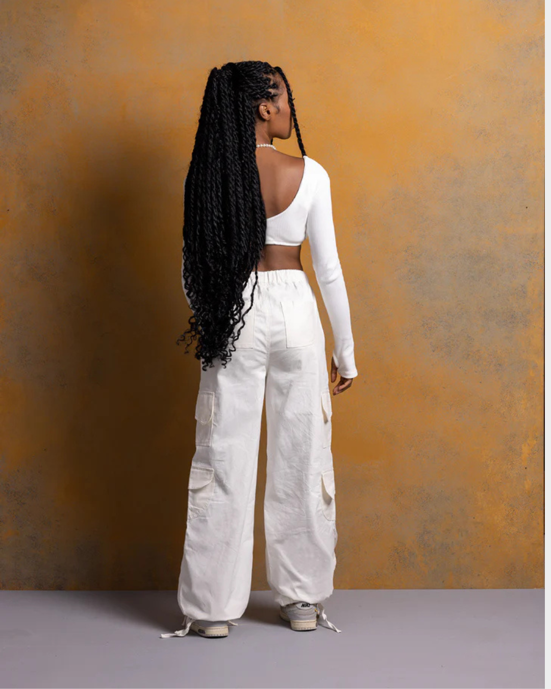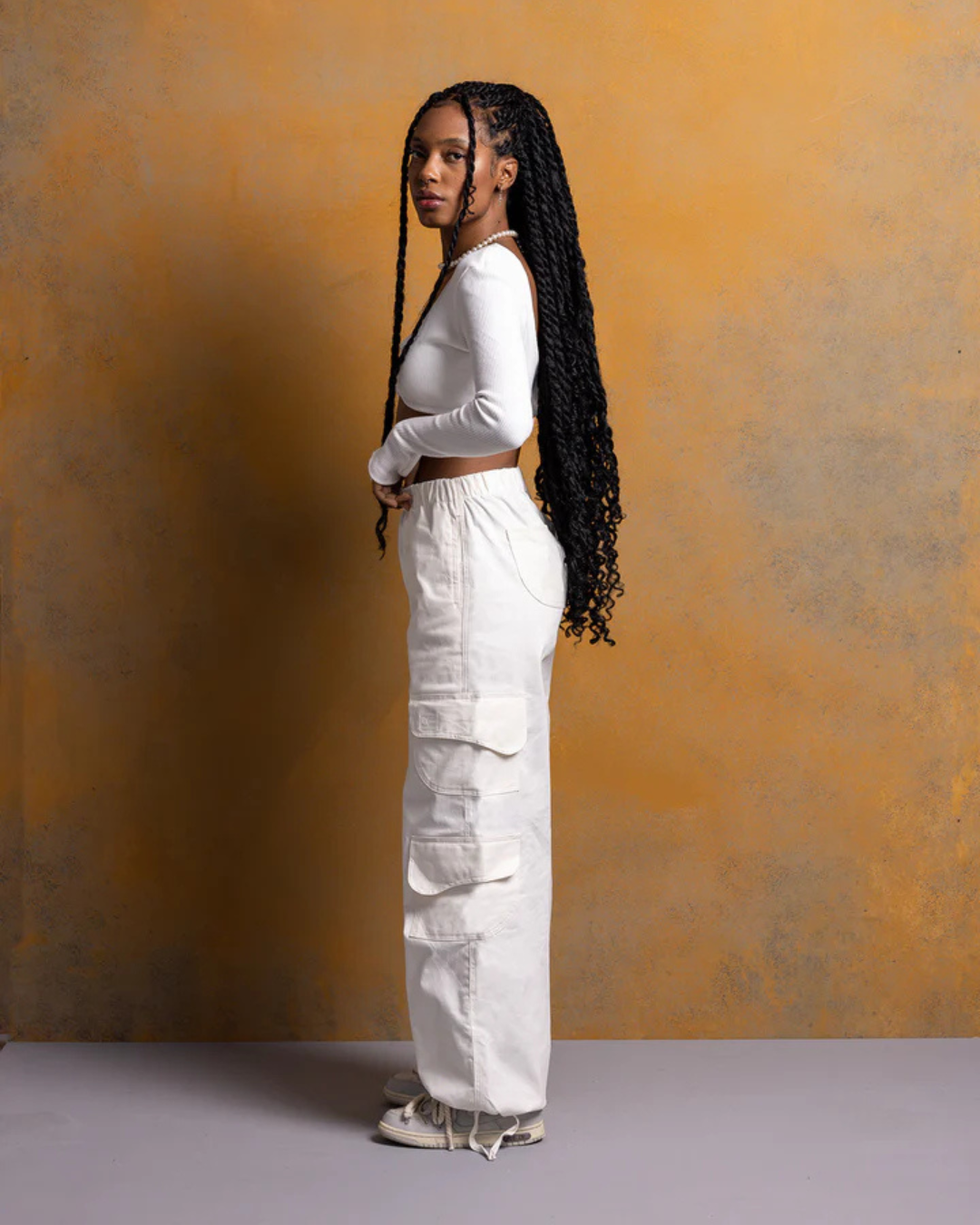 Pantalón fabricado en drill 100% local, fit parachute, pretina enresortada y tirantes reguladores en bajo, cuatro bolsillos signature en piernas, dos bolsillos laterales y posteriores. Marquilla exterior en bolsillo delantero.