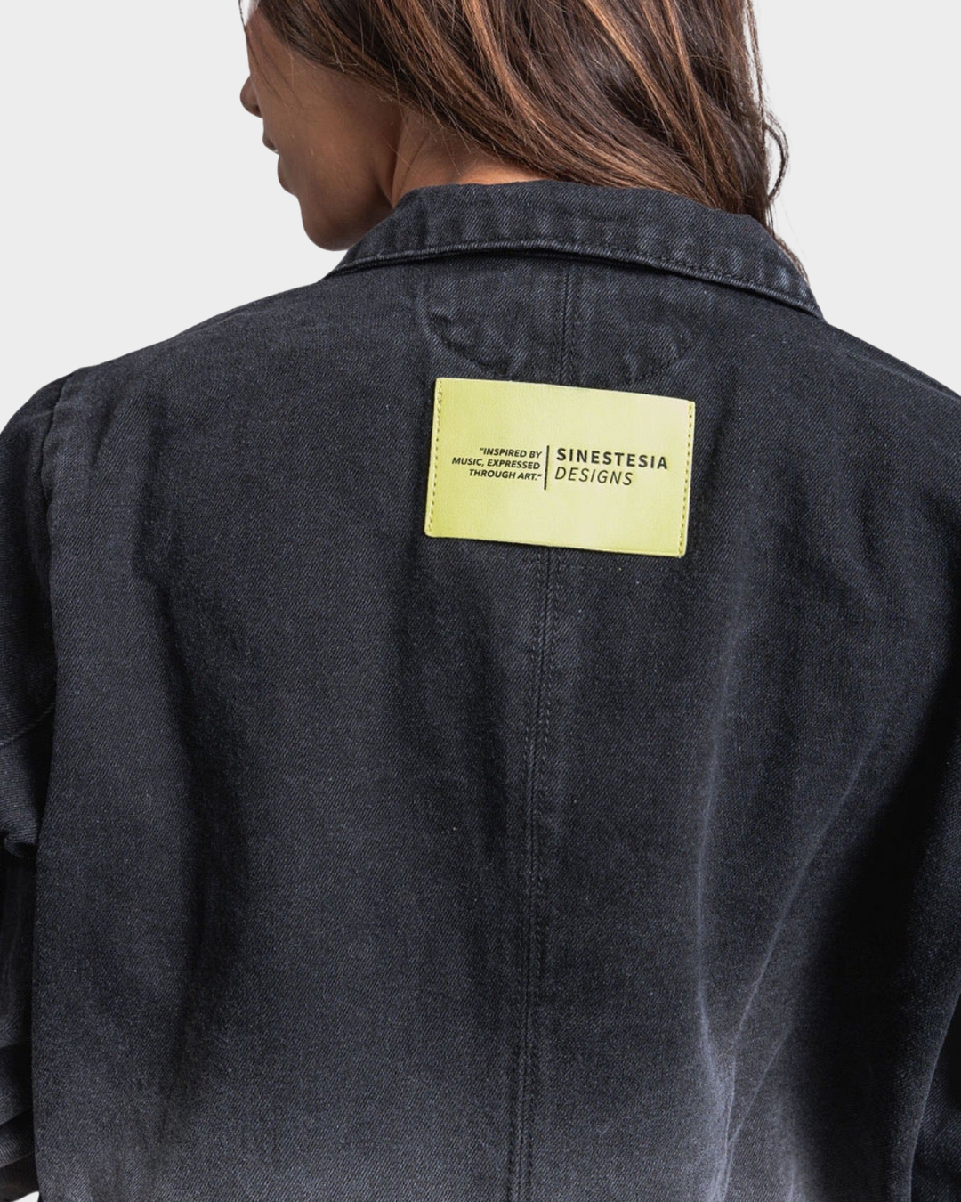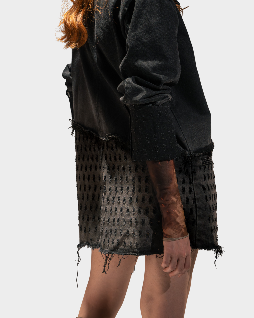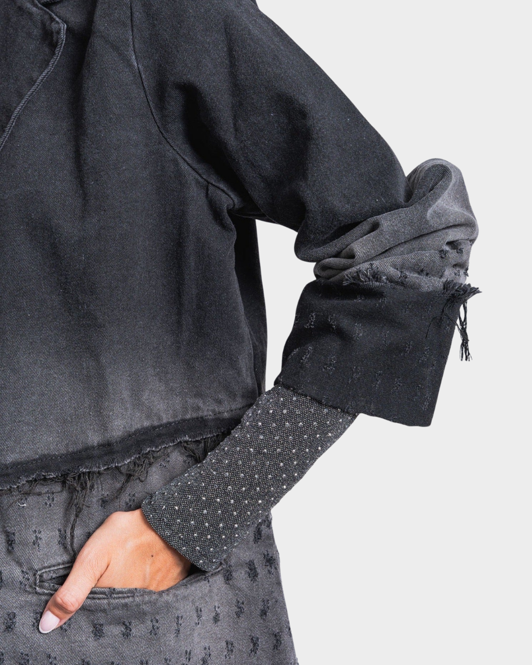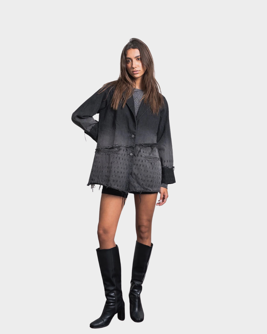 Blazer en denim negro con degradé y un corte en diagonal que destaca por su diseño único. Detalles desflecados y grabado láser en la parte inferior añaden un toque audaz. Cuenta con bolsillos frontales funcionales para complementar su estilo contemporáneo.