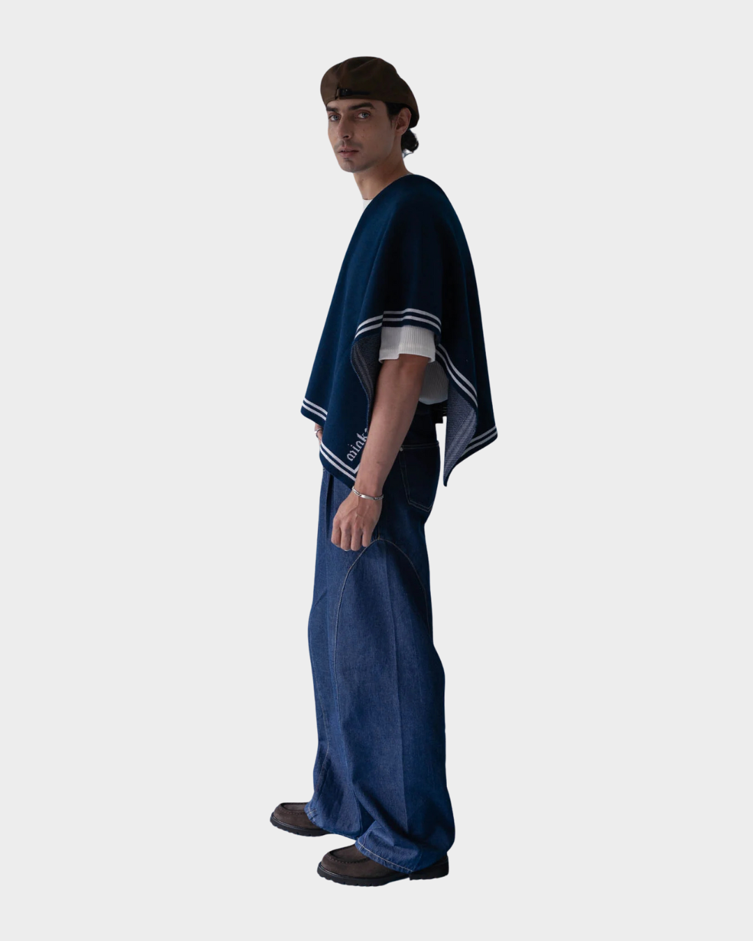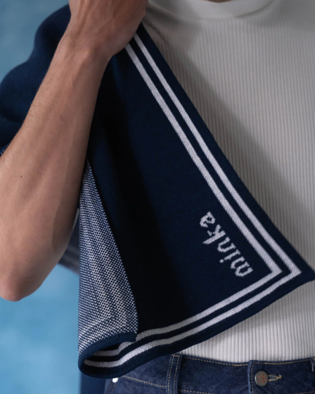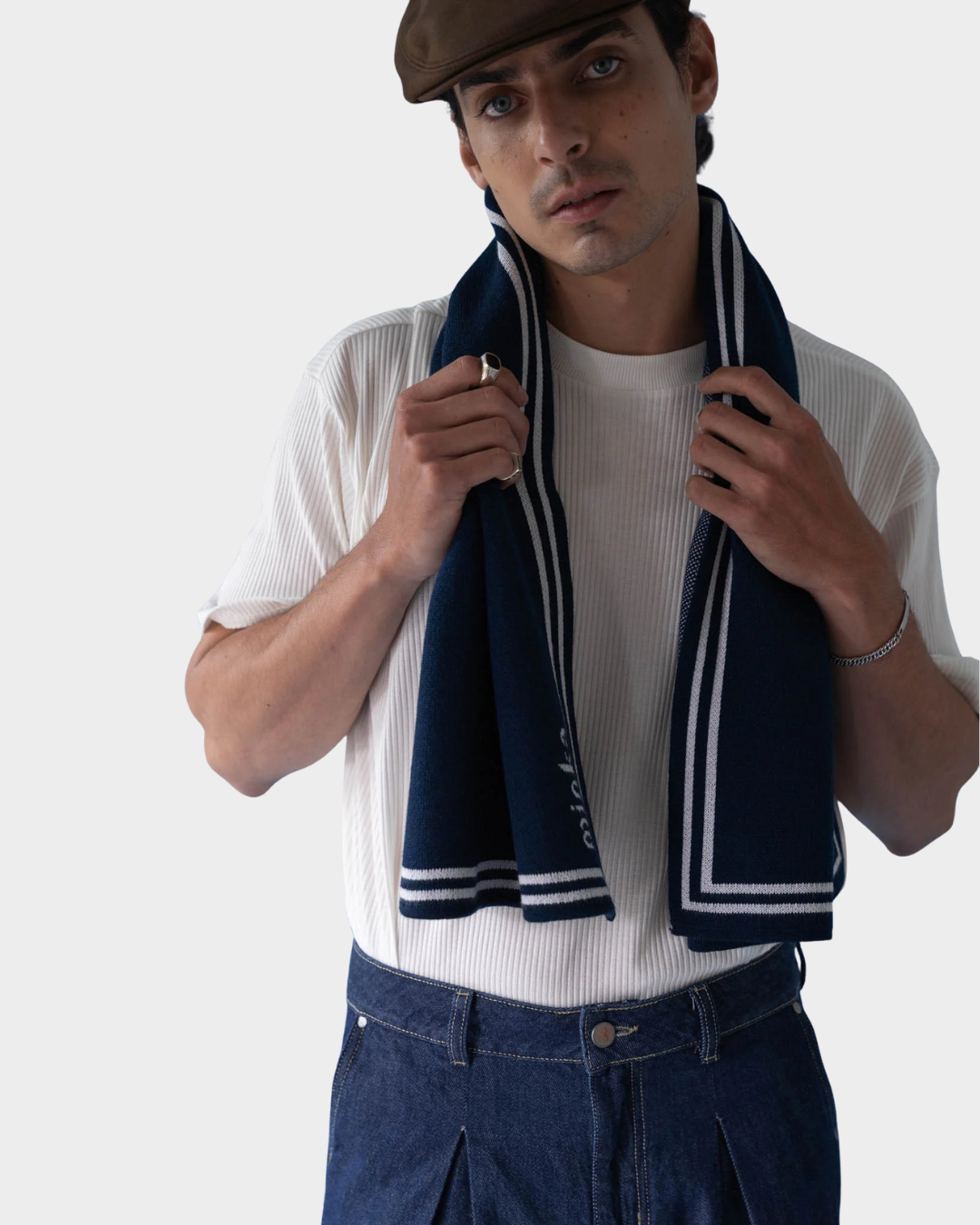 Bufanda rectangular tejida en azul crudo con lineas blancas en contraste de inspiración marinera. Esta pieza esta hecha para envolverse de diferentes formas en el cuerpo, puede ser en el cuello.