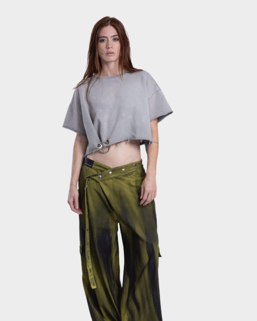 En el frente incluye ojales metálicos a un lado, diseñados para unirse con un mosquetón, permitiendo crear un drapeado o modificar el fit de manera intuitiva.
