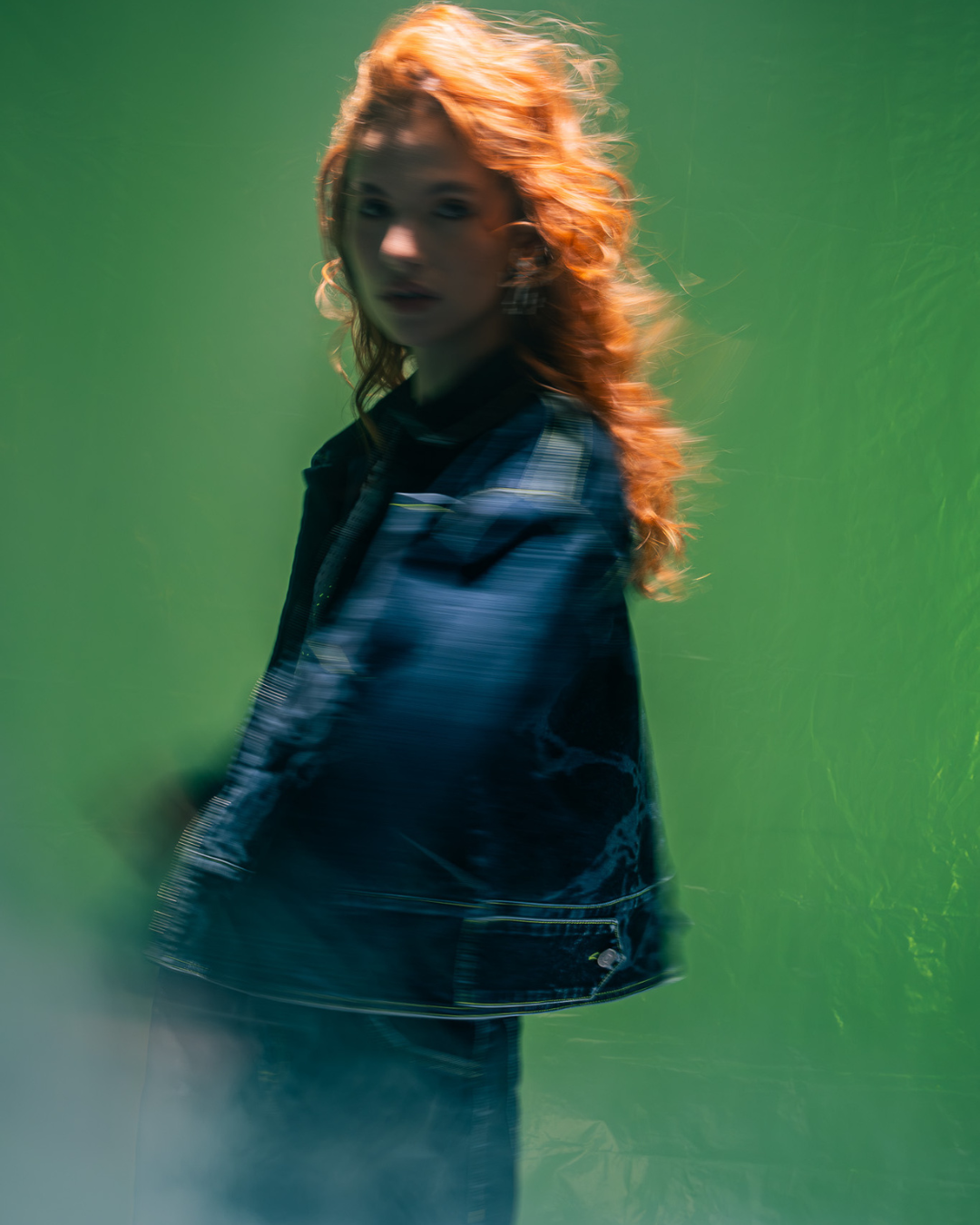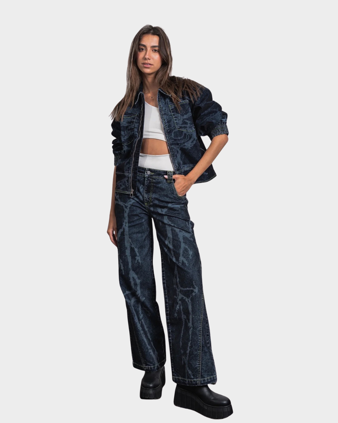 Chaqueta tipo biker en denim con acabado velvet y diseño exclusivo de arterias grabadas con láser. Cuenta con cierre de cremallera y bolsillos internos, combinando estilo, arte y funcionalidad en una sola pieza.