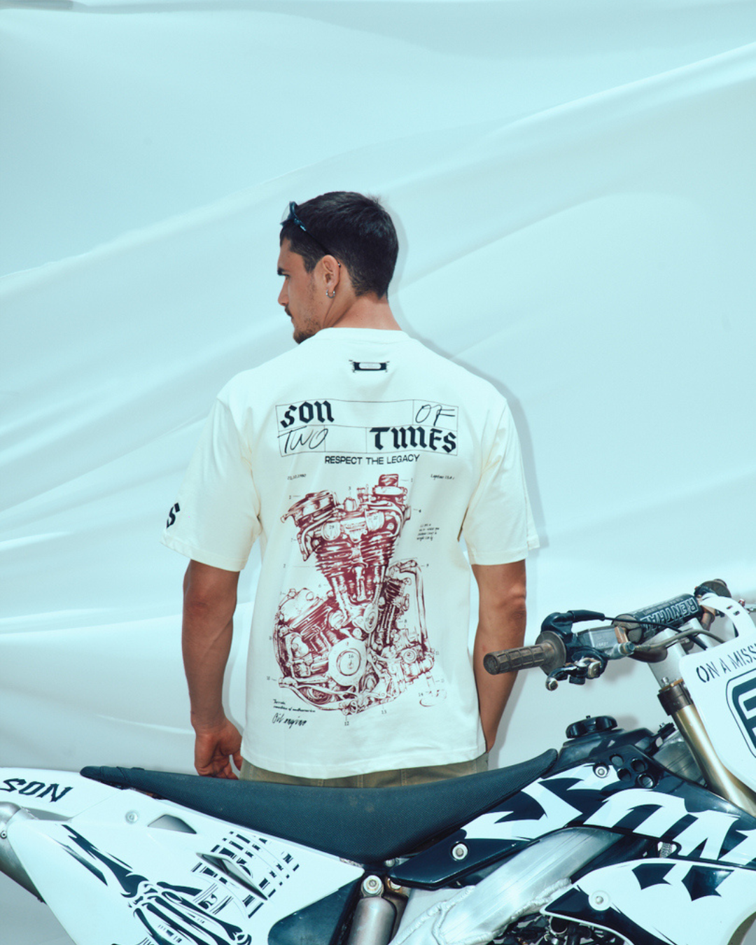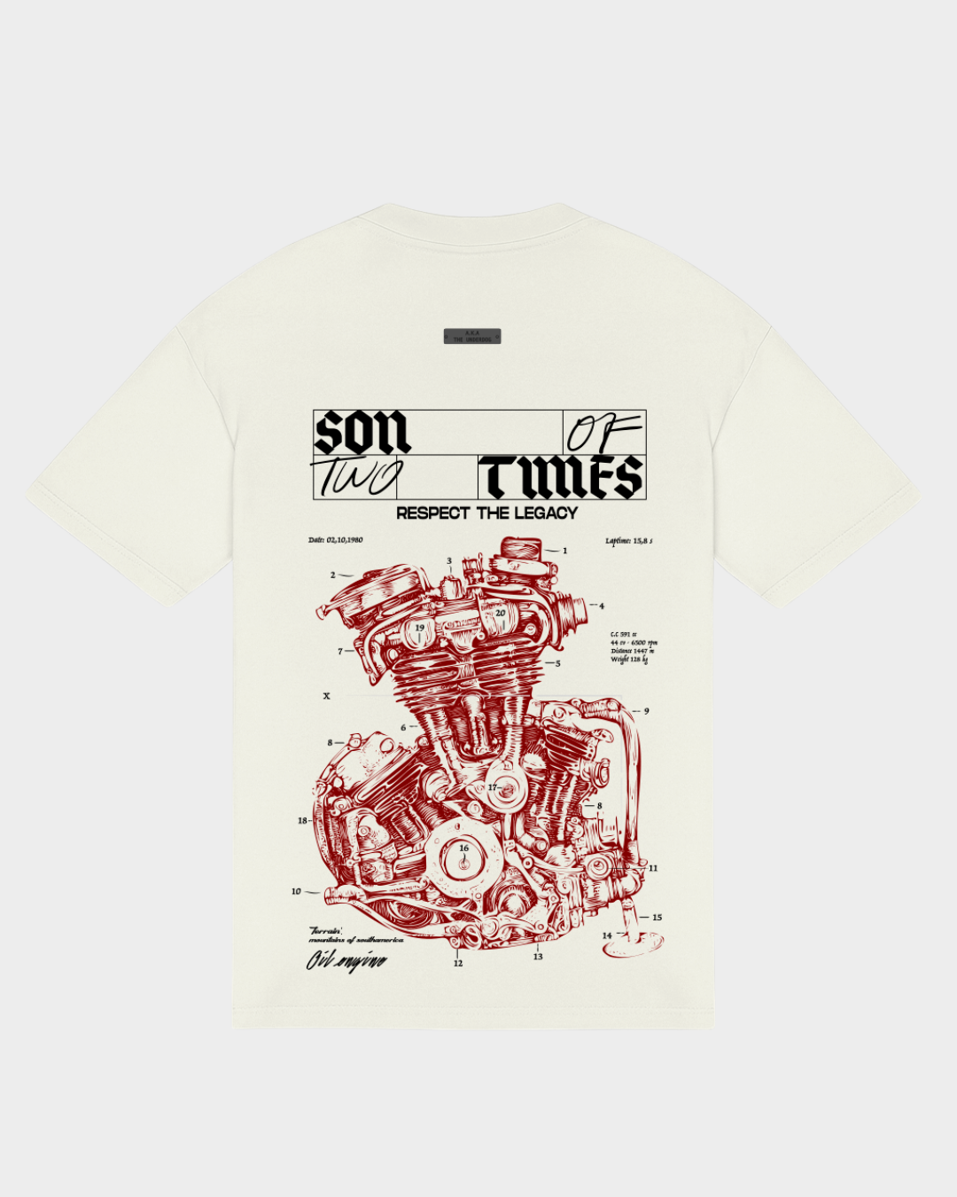 Los motores son el corazón del legado que hemos recibido: gracias a ellos llegamos a la meta, alcanzamos sueños y demostramos la fuerza de lo que somos. Esta camiseta es un tributo a esa herencia mecánica y cultural que alimenta la identidad de Son of Son. Confeccionada en algodón premium de 280 gramos, su fit oversize garantiza comodidad y estilo. El estampado en rojo de un motor clásico resalta sobre el tono crema, evocando la estética de los 90’s y la rudeza de la pista. Perfecta para combinar con prendas inferiores oscuras, creando contraste y reforzando la fuerza del styling.