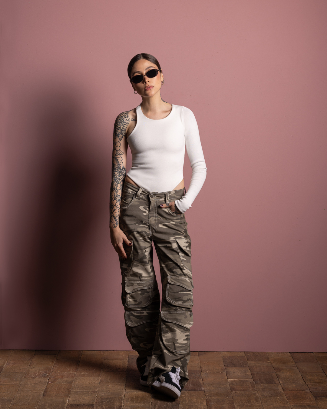 Bodysuit hecho en tejido de algodón de alto gramaje, broche en entrepierna, tiro alto, escotes curveados, doble textil en frente y espalda para mayor soporte y cubrimiento. Su manga tiene abertura en pulgar.