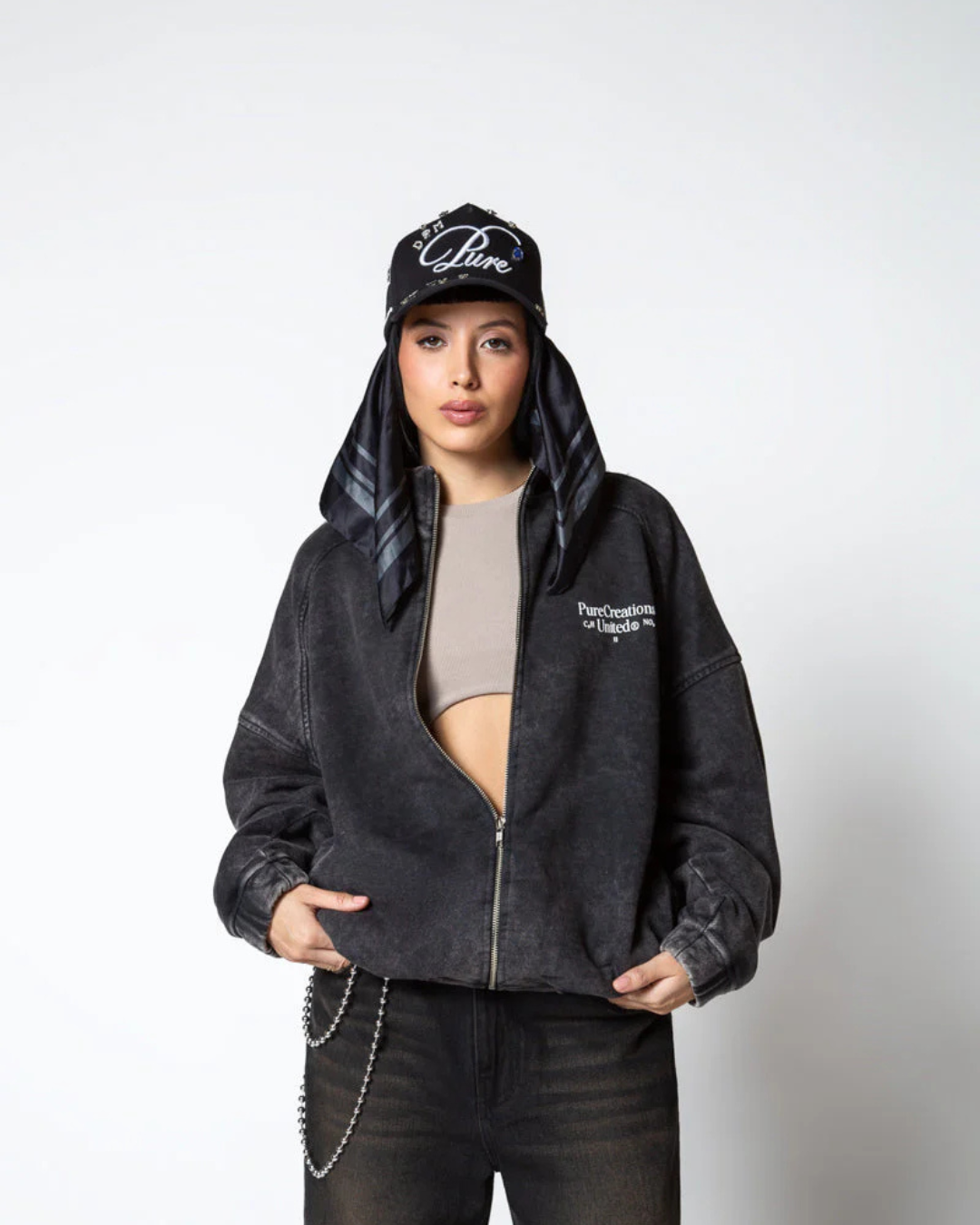 Chaqueta color negro lavado. Fit Box fit. Tela: 100% algodón. Alto gramaje (400 gr). Estampado en el frente y marquilla tejida en la espalda. El modelo mide 1,83 cm y está usando talla L.