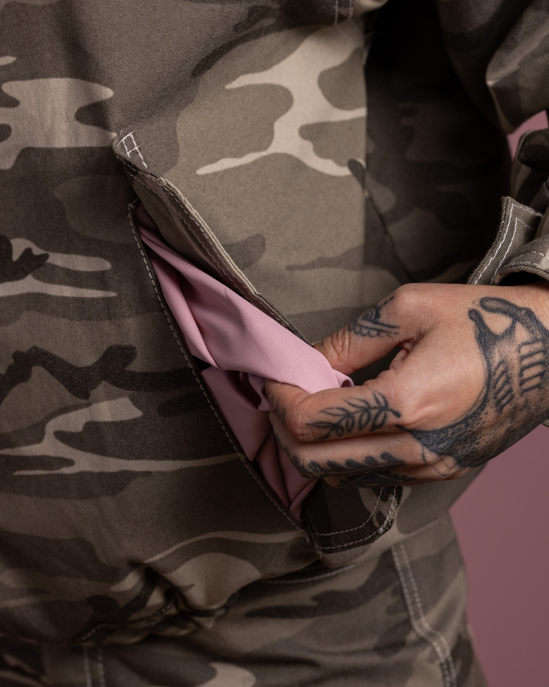 Chaqueta aviator fit, genderless, hecha en drill liviano de gramaje medio, forrada con textil suave y liviano bordado en pecho, marquilla exterior en espalda. Resorte en parte inferior, botonadora en puños. Todos sus avíos son inoxidables.