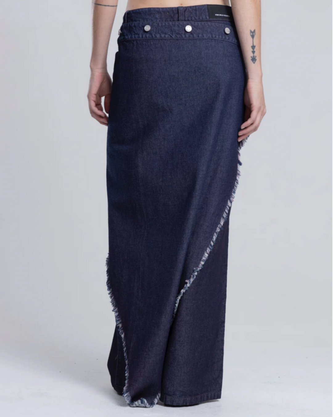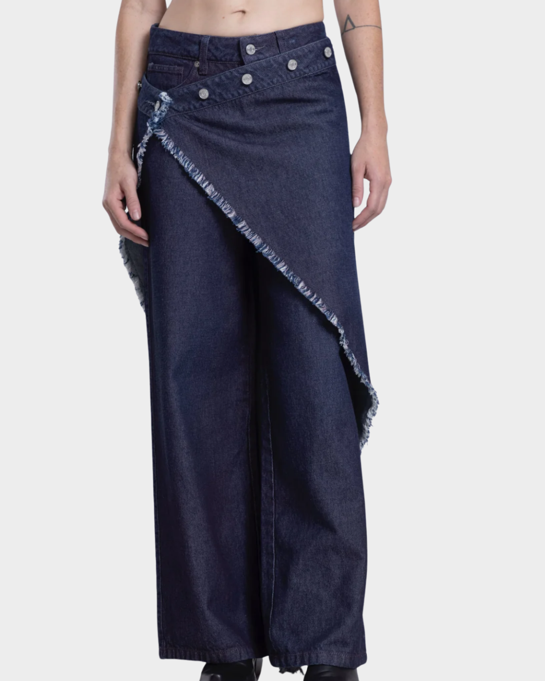 Incluye una capa desmontable, desflecada y cruda, que transforma por completo la pieza. Puedes usarla encima para un look más escultórico o retirarla para un jean minimalista. Ambas piezas funcionan por separado, multiplicando su versatilidad.