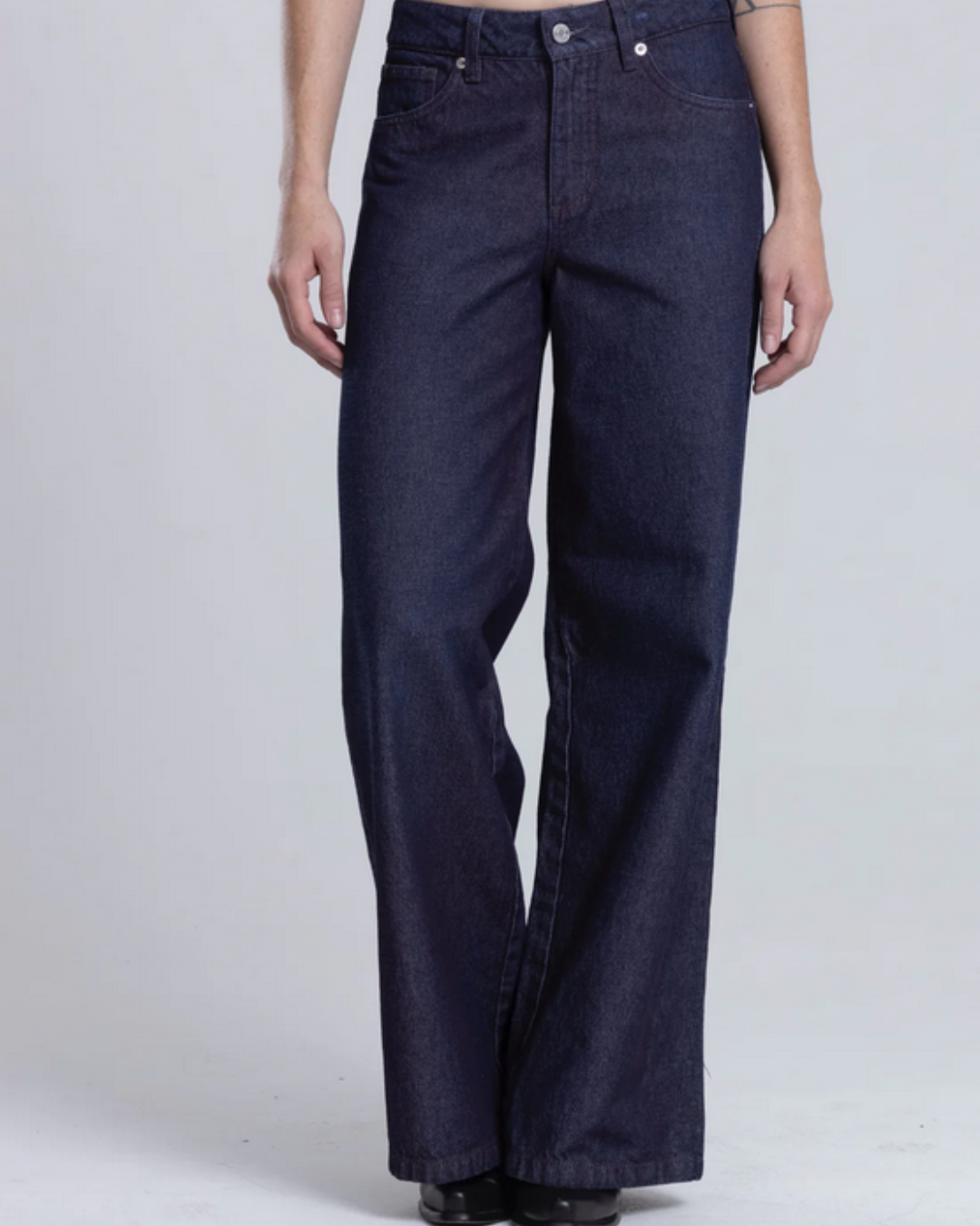 Estos jeans en denim raw azul oscuro están intervenidos con spray localizado en tono uva/vino, un sombreado sutil que aparece como una emoción contenida que apenas se revela.