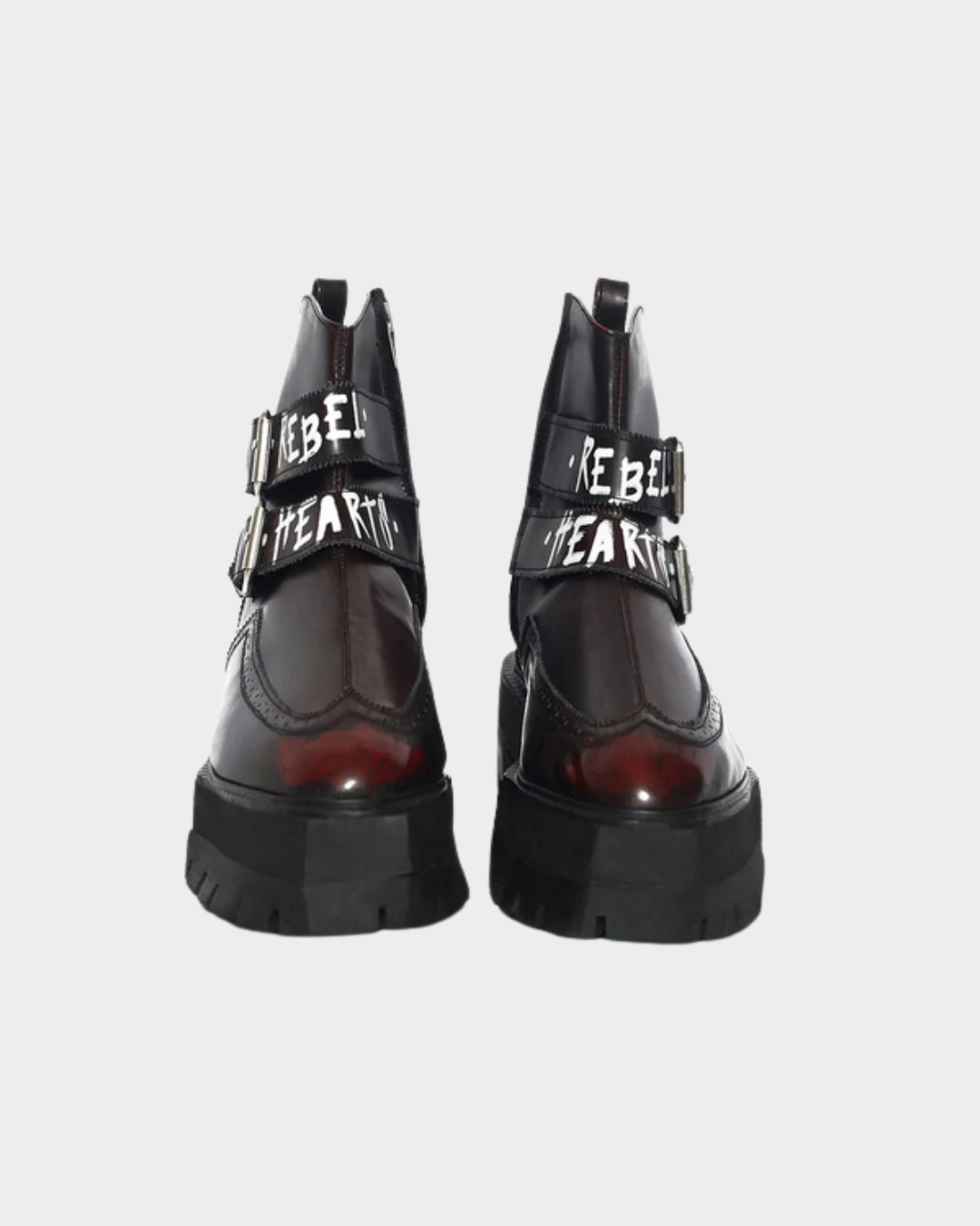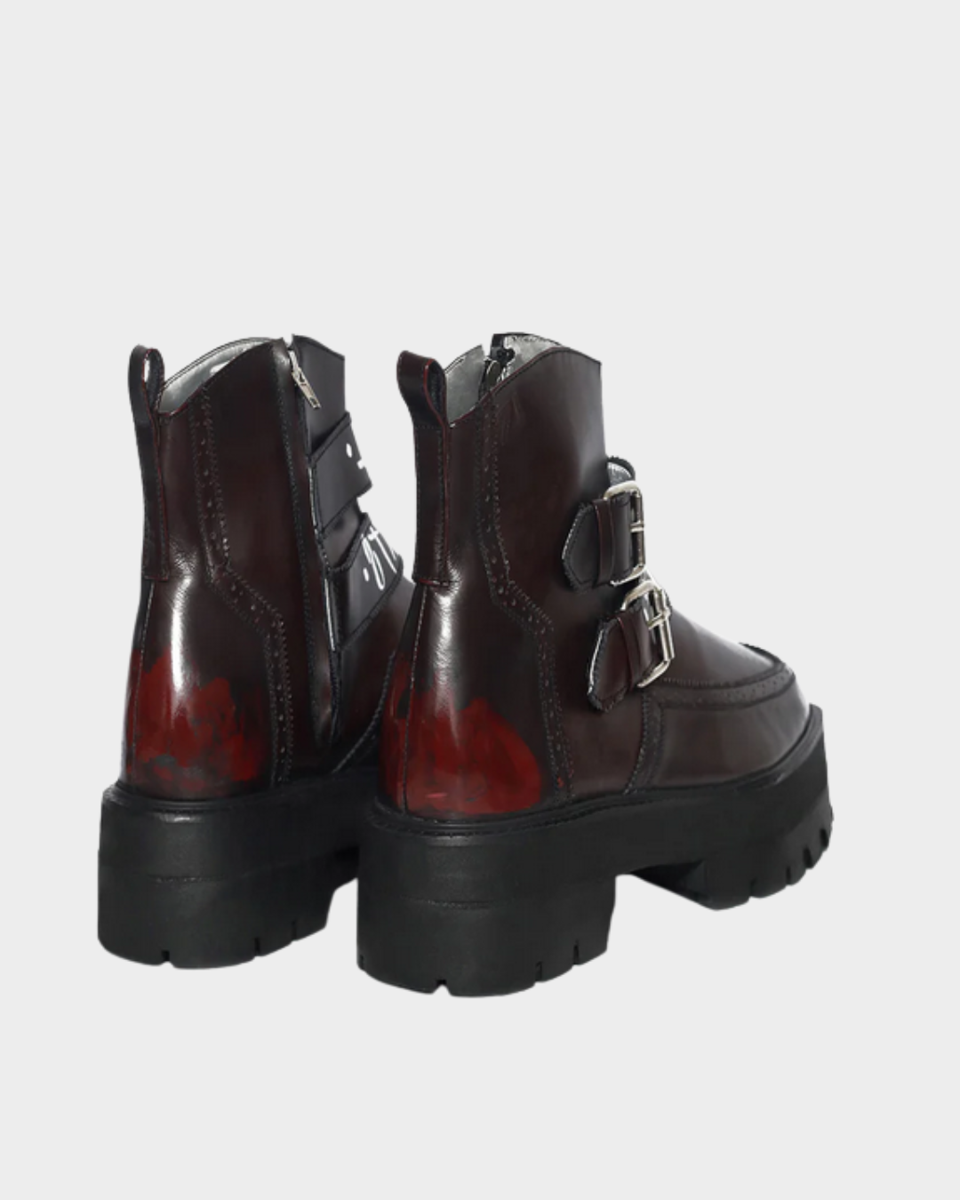Botín tipo Oxford en cuero Riviera vinotinto, desgastado a mano, correas estampadas mediante serigrafía manual en caucho blanco y cremallera interna en nylon, Cuentan, también con forro en Badana negra, plataforma angular de 4 cms, capa en cuero desgastado y suela extra gruesa R1 en caucho negro. Mr. Kennedy at his best.
