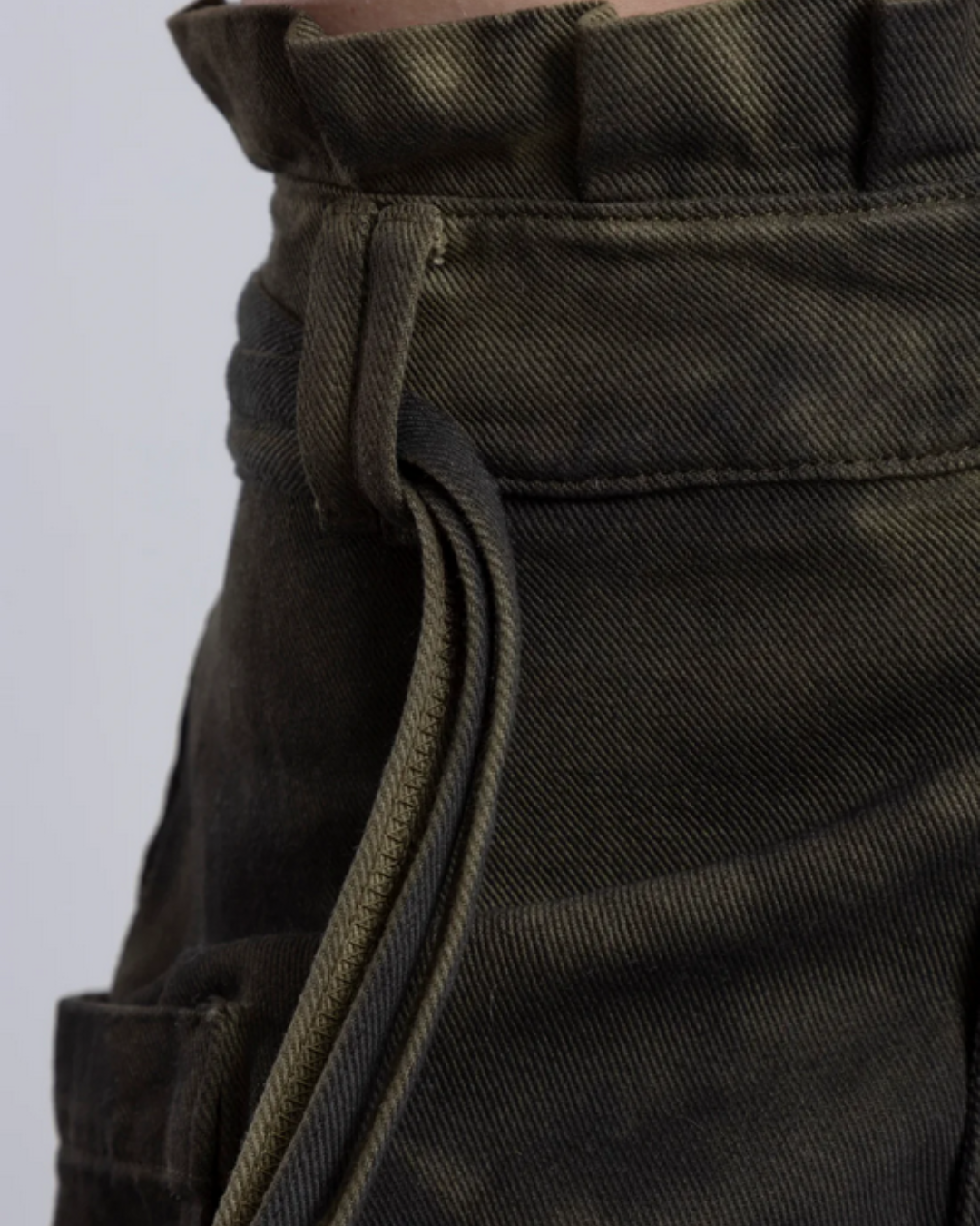 En los laterales, dos canales con elástico y tancas permiten ajustar y generar un fit medio bombacho o más recogido, transformando la caída según cómo quieras llevarla. Se complementa con un cinturón con cordones para marcar la cintura y equilibrar volúmenes.
