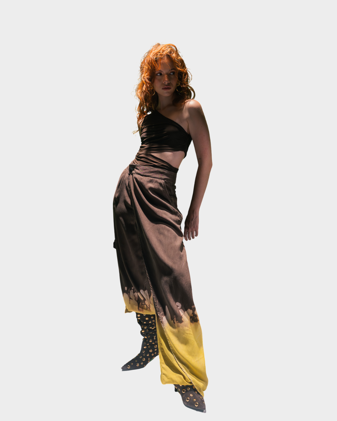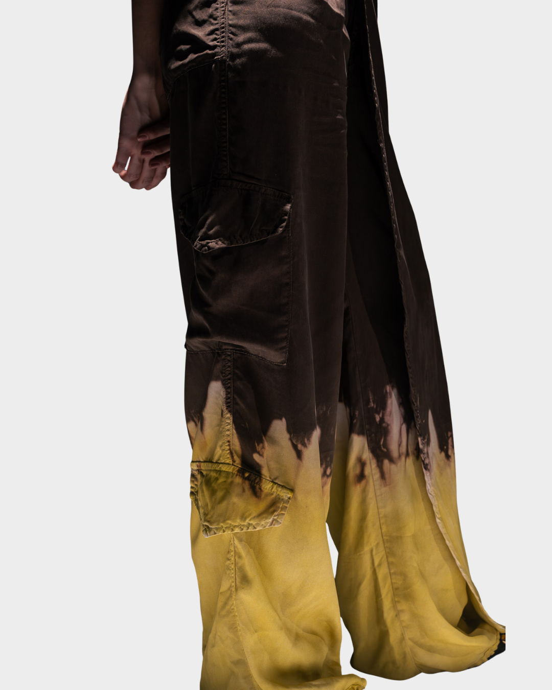 Pantalón de tiro alto en drill fluido, tono café, con tinturado tie dye hecho a mano en las botas. Diseño único con bolero en el frente y ajuste en las botas mediante tanca y elástico.