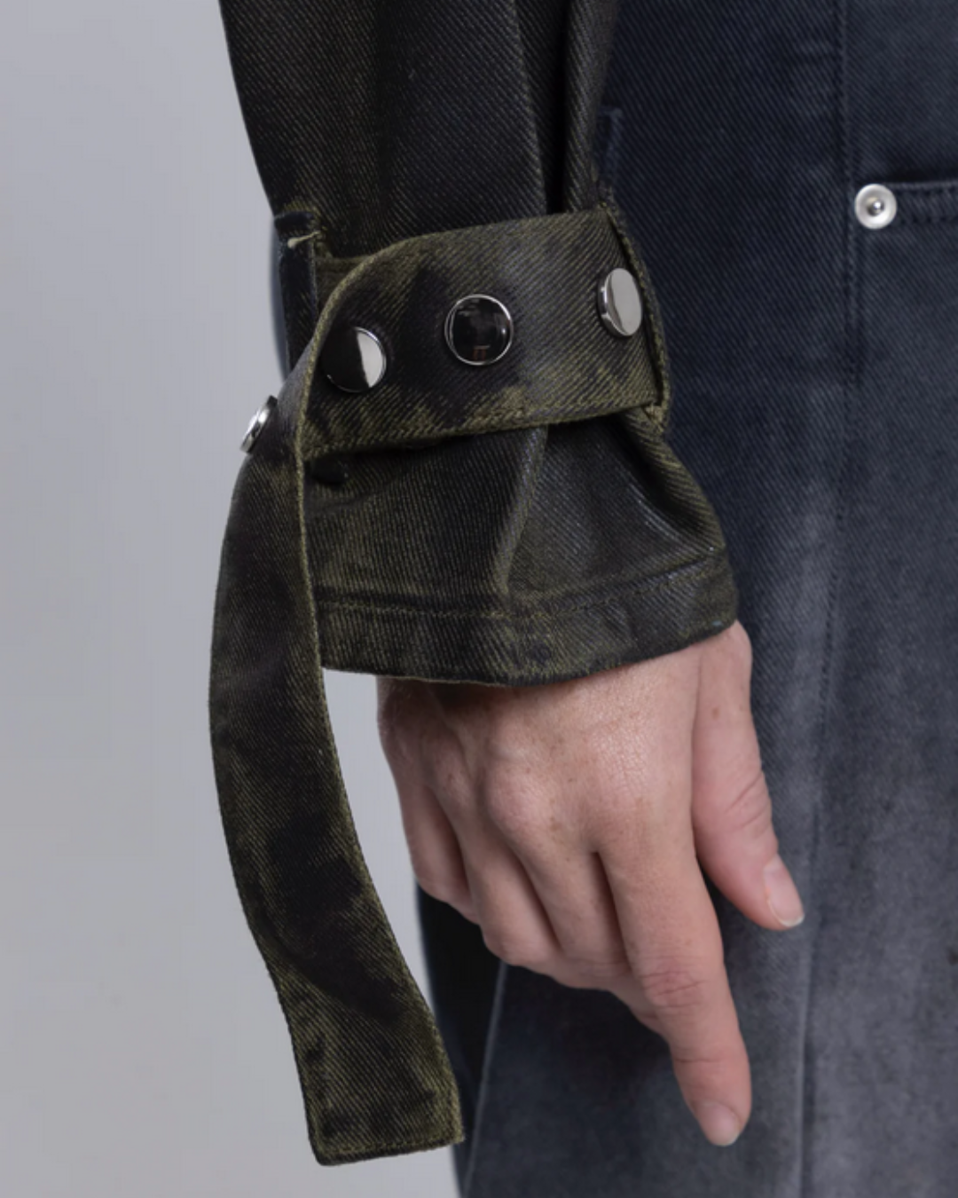 Hecha en denim 100% algodón en tono verde oliva, está intervenida con un encerado en negro que genera un efecto profundo, casi ahumado, como si la prenda hubiera pasado por un fogonazo de emoción.
