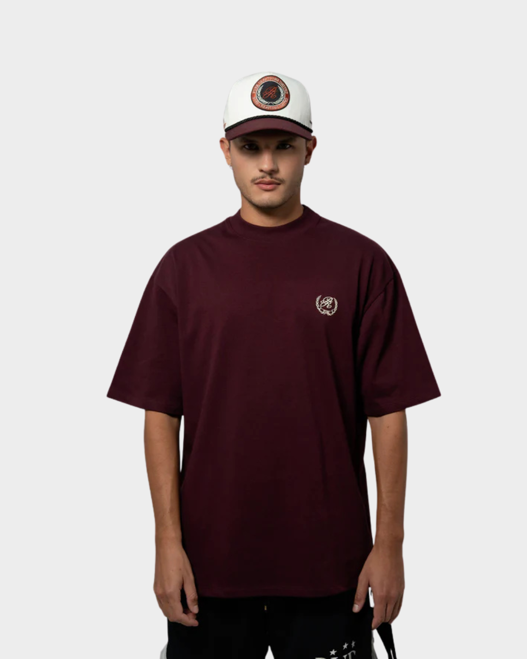 Camiseta color Vinotinto con diseño minimalista y gráfico. en la parte frontal presenta un estampado en alta densidad ubicado en punto corazón, complementado en la parte posterior con diseño tipográfico y gráfico con movimiento. Una pieza única y versátil. Color: Vinotinto.Fit: Oversized.Composición: 100% Algodón. 250 Gramos .Logo en pectoral estampado en plastisol de alta densidad con plastisol de alta densidad en espalda. Unidades limitadas. El modelo mide 1.78 mts y está usando una prenda talla M.