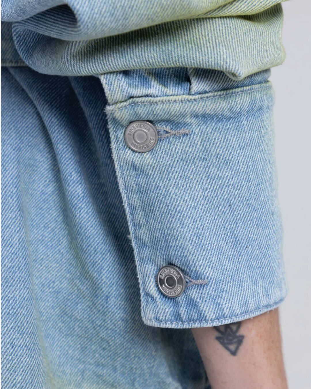 Confeccionada en denim claro 100% algodón, está intervenida con un lavado en tono lima —un degradado suave que ilumina la prenda y crea un efecto vibrante como un pulso que se expande.